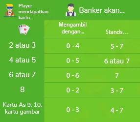 Jika Player mendapatkan kartu ketiga, Banker mengambil sebuah kartu ketiga berdasarkan peraturan sebagai berikut: